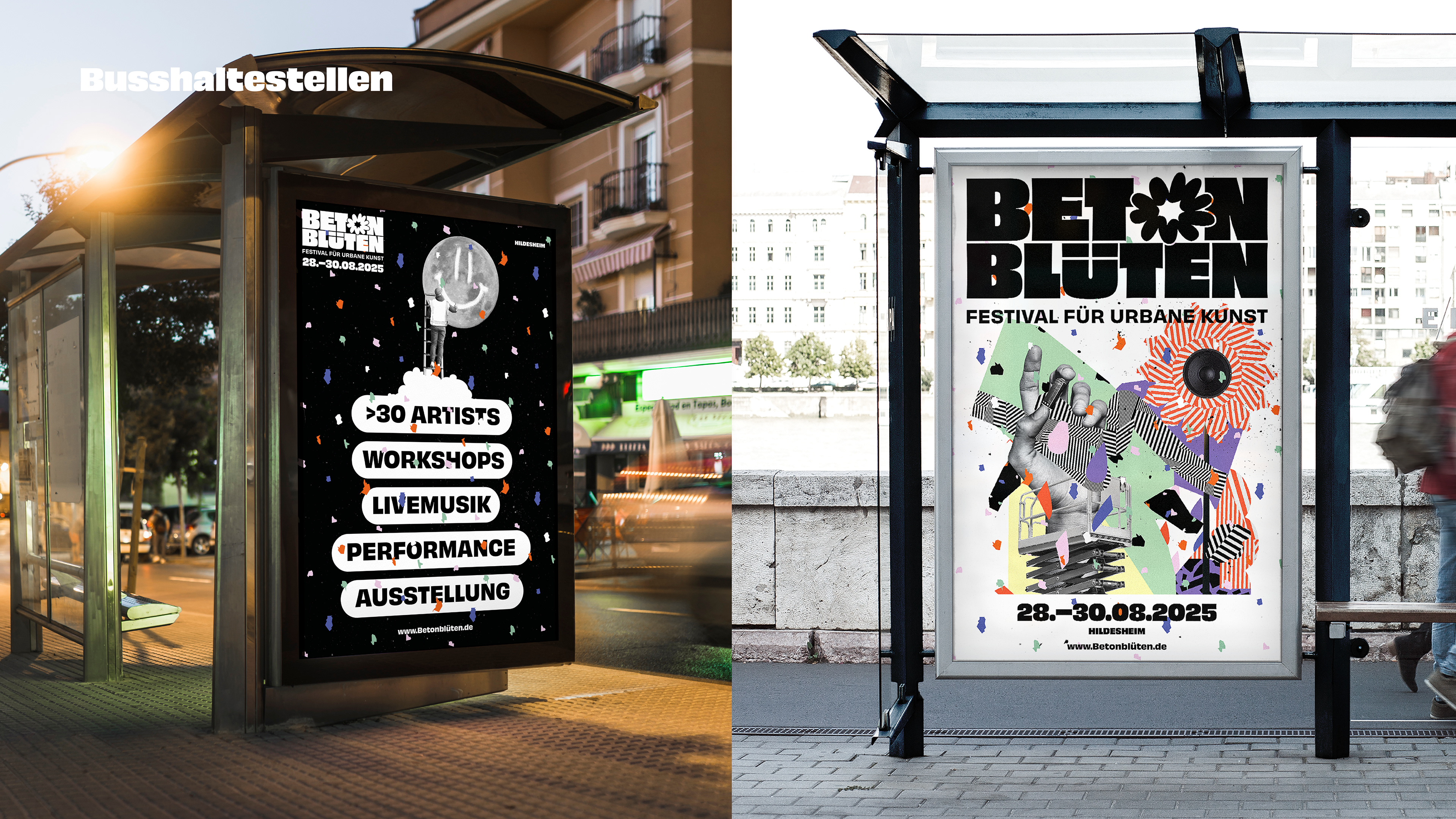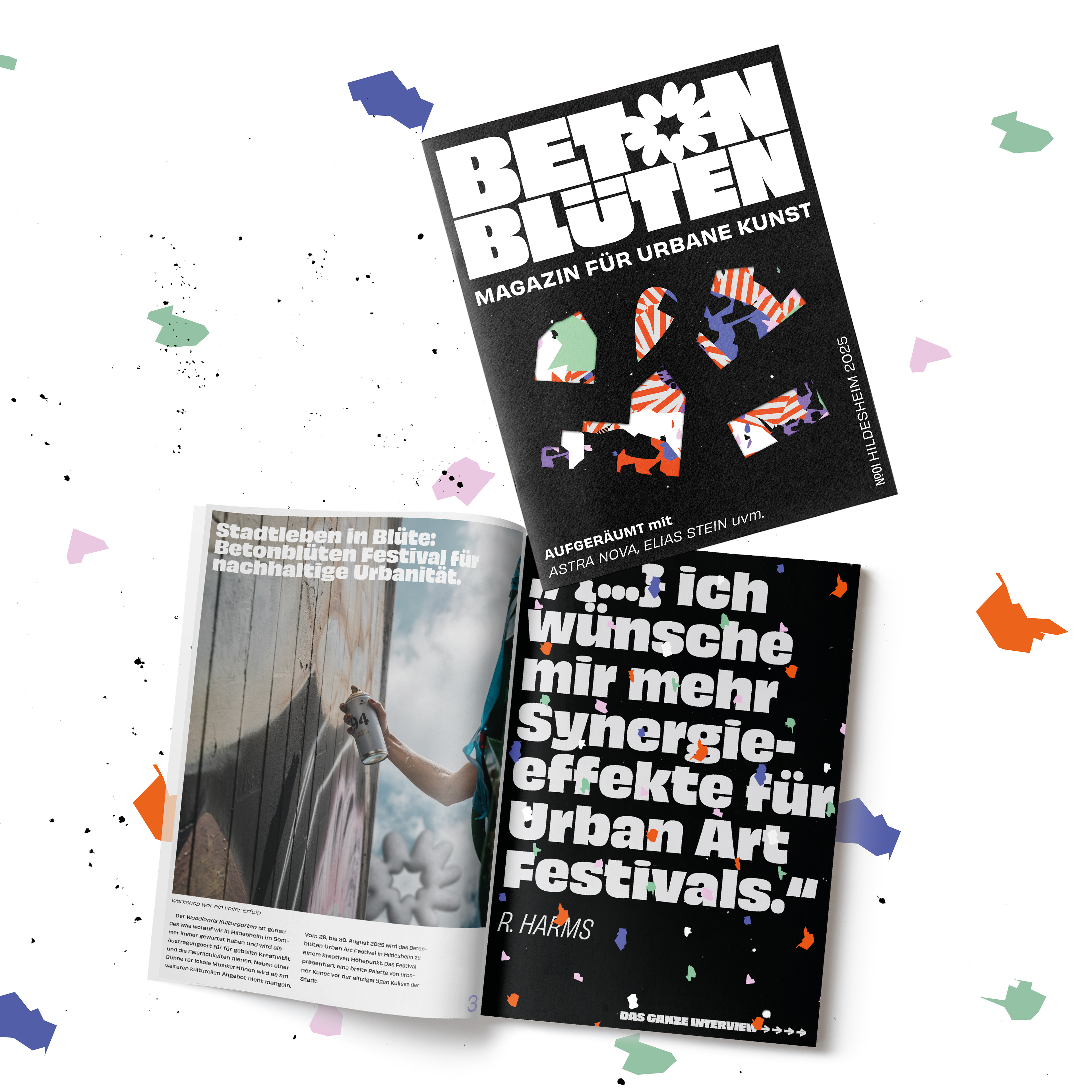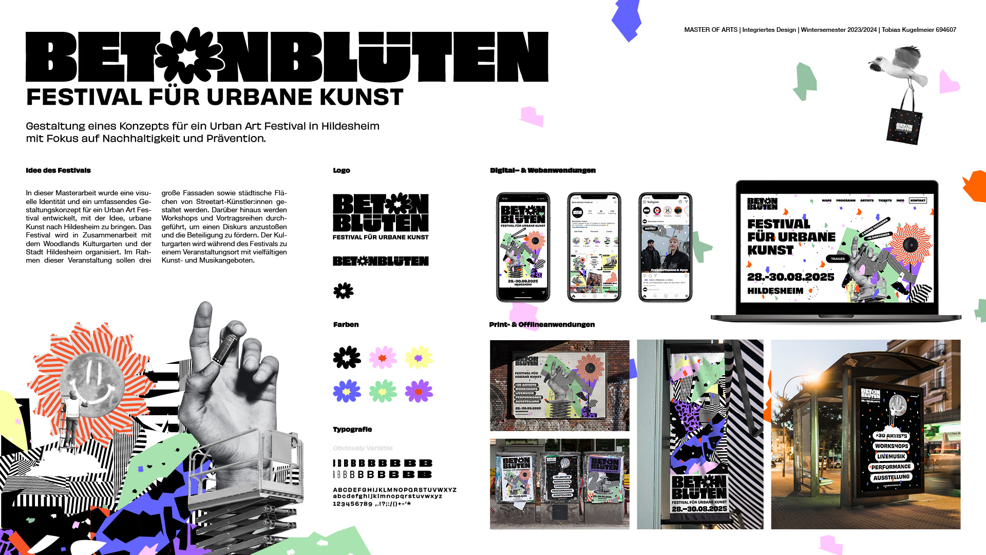 Im Rahmen meiner Masterarbeit ist ein Konzept für ein urban Art Festival entstanden, dass 2025 in Hildesheim realisert werden soll. Aktuell finden Gespräche mit der Stadt und dem Kulturbüro statt. Das Betonblüten – Festival für urbane Kunst strebt danach, Bewusstsein zu schaffen, die Gemeinschaft zu stärken und innovative Wege aufzuzeigen, wie Kunst, Nachhaltigkeit und soziale Verantwortung miteinander verschmelzen können. Das Konzept umfasst ein umfangreiches visuelles Corporate Design, das die Festivalziele widerspiegelt und auf kreative Weise erlebbar macht.