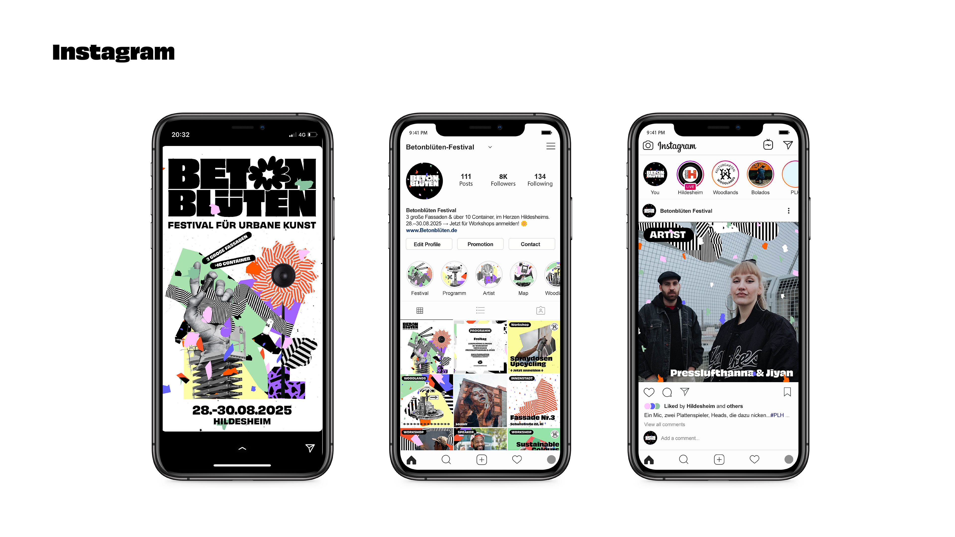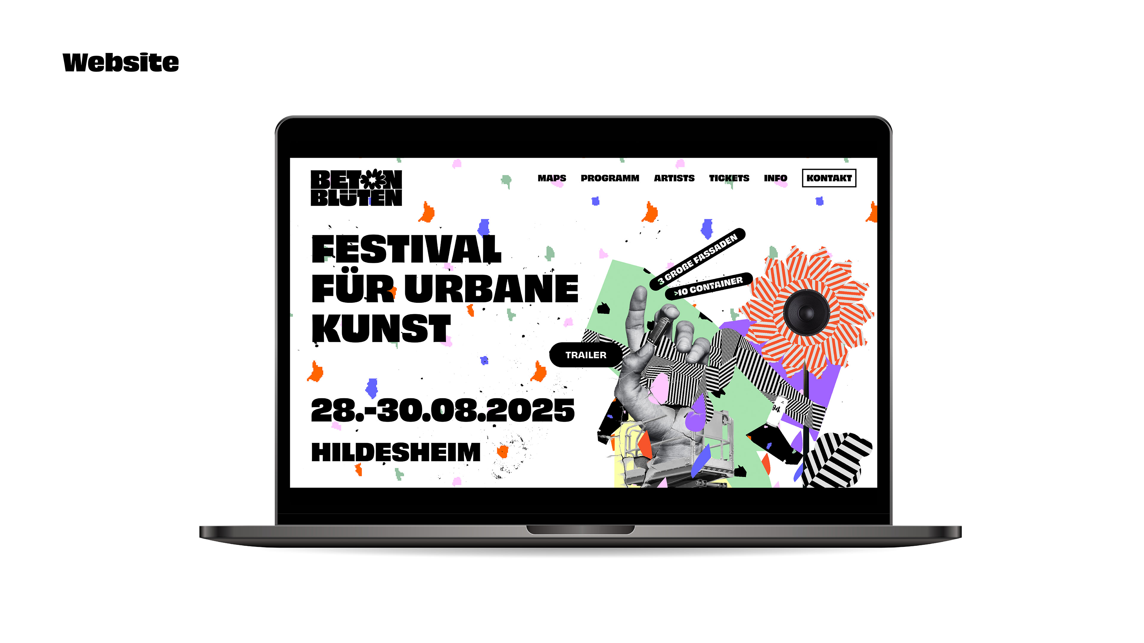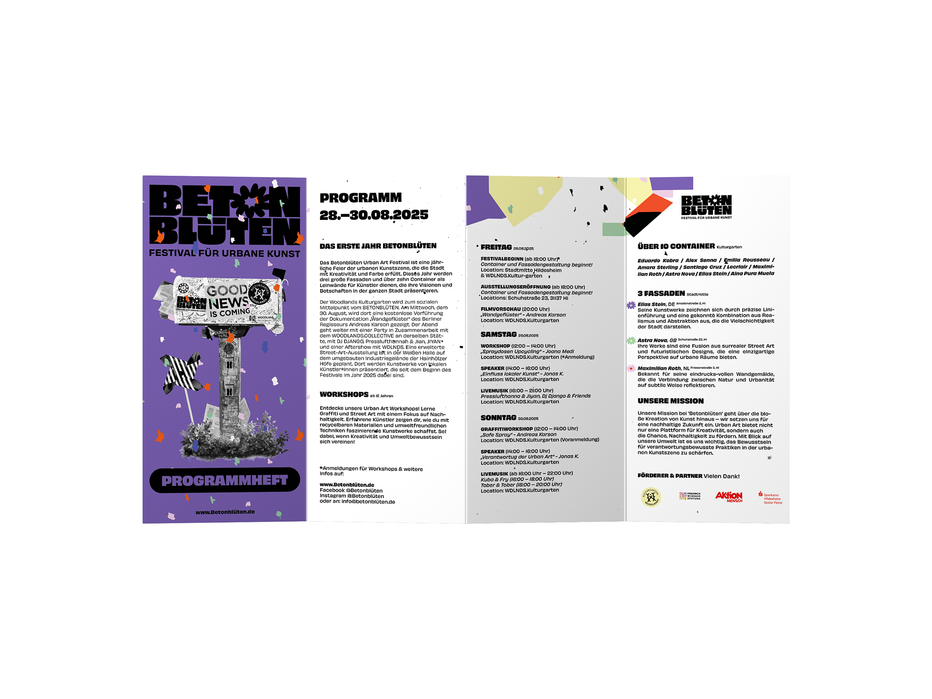 Im Rahmen meiner Masterarbeit ist ein Konzept für ein urban Art Festival entstanden, dass 2025 in Hildesheim realisert werden soll. Aktuell finden Gespräche mit der Stadt und dem Kulturbüro statt. Das Betonblüten – Festival für urbane Kunst strebt danach, Bewusstsein zu schaffen, die Gemeinschaft zu stärken und innovative Wege aufzuzeigen, wie Kunst, Nachhaltigkeit und soziale Verantwortung miteinander verschmelzen können. Das Konzept umfasst ein umfangreiches visuelles Corporate Design, das die Festivalziele widerspiegelt und auf kreative Weise erlebbar macht.