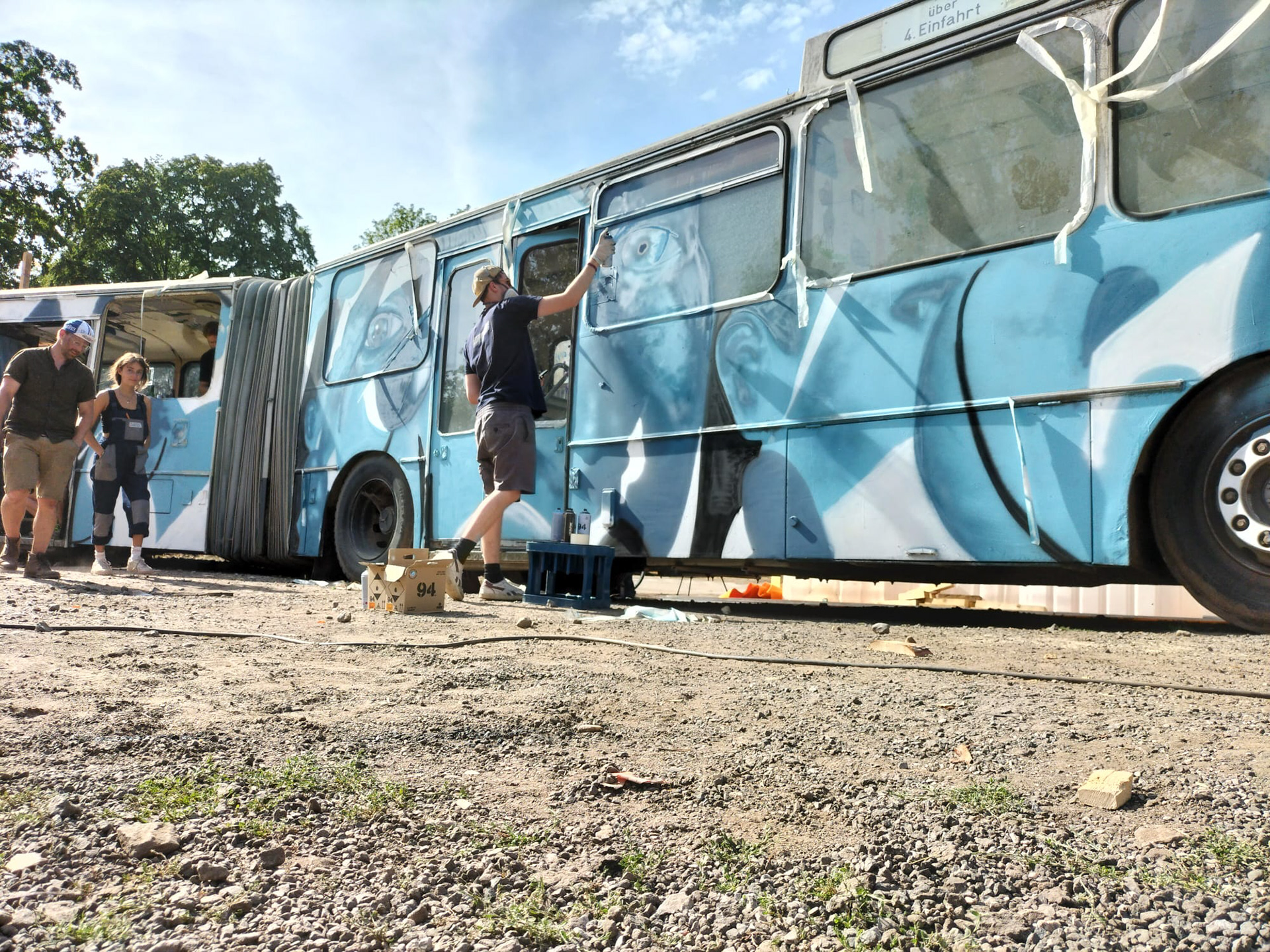 Im Rahmen des SNNTG Festivals 2022 durfte ich einen riesigen Gelenkbus gestalten. Mit Sprühdosen schuf ich ein surreales Bild in verschiedenen Blaunuancen. Das Festival bietet mir immer wieder die Chance, Neues auszuprobieren, wie die realistischen Schattierungen von Gesichtern, die ich in diesem Artwork umgesetzt habe. Es ist eine inspirierende Plattform, um meine kreativen Fähigkeiten weiterzuentwickeln und mit anderen Künstlern in einem dynamischen Umfeld zu interagieren.